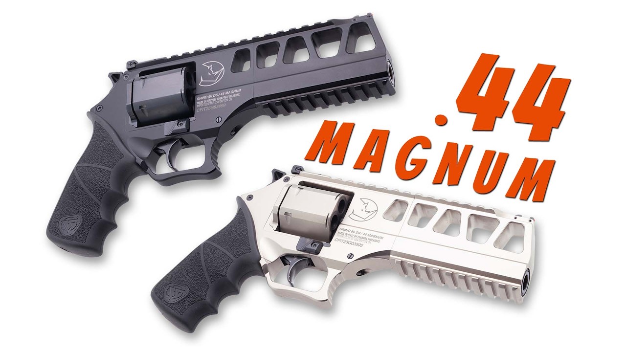 All variants feature a full-length top and bottom Picatinny rail for optics and accessories; a fixed fiber-optic front sight and a rear adjustable fiber-optic sight; a set of finger stops on both sides of the frame; a redesigned trigger guard and faux hammer/cocking lever; and a redesigned barrel shroud and sighting rib. The combination makes the new "L-Frame" Chiappa 60DS Rhino .44 Magnum revolvers excellent for target or silhouette shooting, home and property defense, large-game hunting, or protection against aggressive predators in the great outdoors.