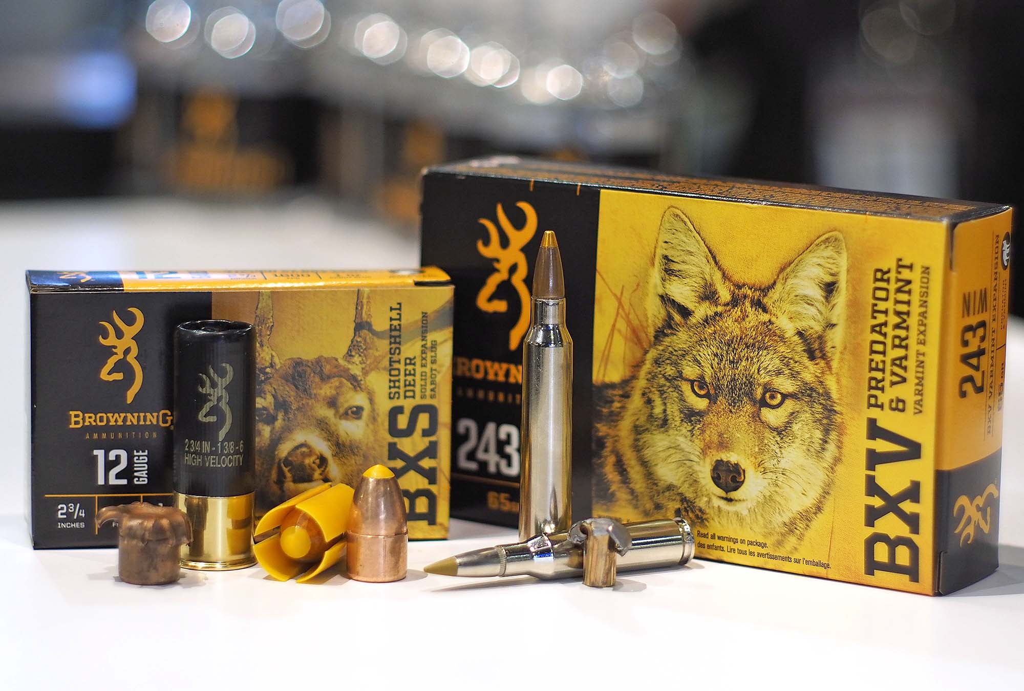 Talking about rifle ammunition, the Browning BXV Predator & Varmint rapid expansion loads in calibers such as .22 Hornet, .22-250 Remington, .243 Winchester and .223 Remington offer flat-shooting, rapid-expansion, polymer-tipped bullets loaded in a nickel-plated shellcase with improved ballistic coefficient and massive energy deposit.