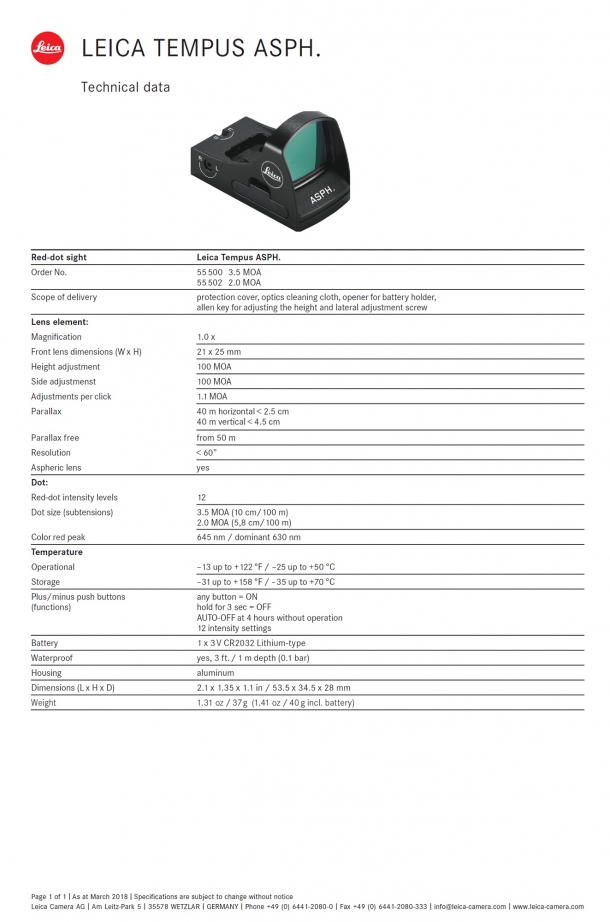 Il Tempus ASPH è il primo red dot di Leica: compatto e leggero, offre tutta la qualità costruttiva e la raffinatissima costruzione ottica che caratterizza da sempre le creazioni dell'azienda di Wetzlar assieme alla massima flessibilità, sicurezza e rapidità di tiro su bersagli anche in movimento